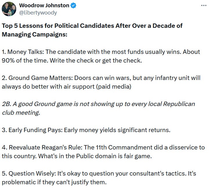 Woodrow Johnston tweeted his lessons for political campaigns this morning as I was writing this article. He is an experienced campaign manager who helped Scott Herndon defeated a longtime incumbent in 2022.