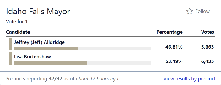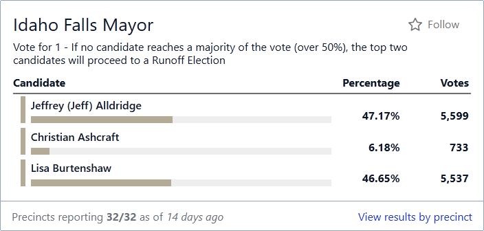 Going into the runoff, I believed Ashcraft’s voters would break for Alldridge, since I saw both candidates as outsiders campaigning against the local establishment. That does not appear to have happened. Considering how influential religious differences seemed to be in this race—recall that Alldridge, the only non-LDS candidate, was asked by an East Idaho News reporter for his opinion on Mormons—I wonder if that proved a more decisive factor than expected. Members of the LDS Church make up between 50% and 75% of Idaho Falls’ population, depending on the source, and that undoubtedly plays into local politics.