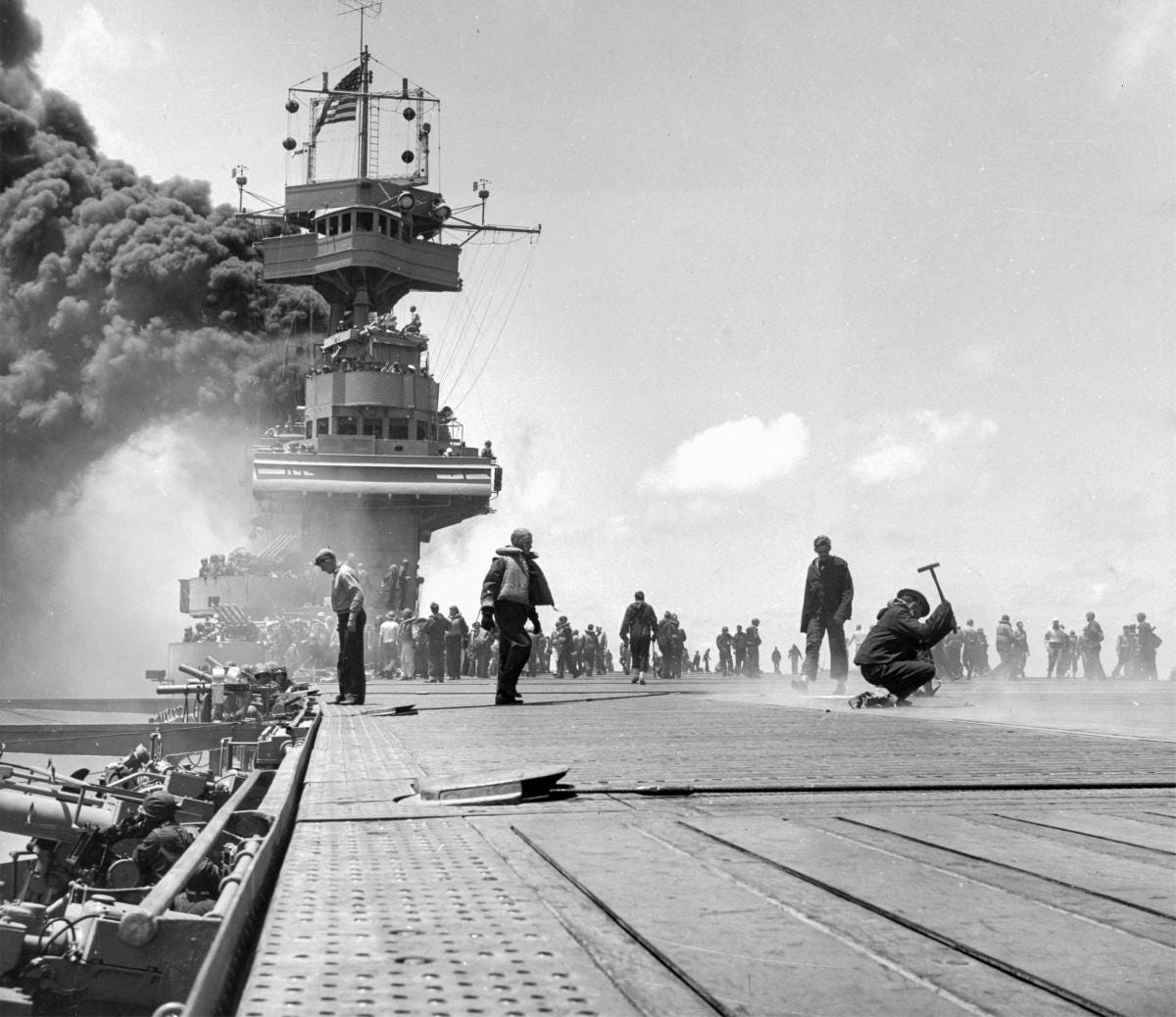 The US Navy’s damage control personnel were legendary. Repair teams worked around the clock to keep Yorktown afloat and soon she was steaming for Pearl Harbor. The Navy Yard initially estimated that repairs would take at least two weeks, but two days later she was back in shape and headed for Midway.
