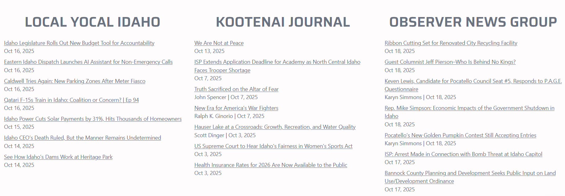 In the meantime, I’ve expanded my partnership with other Idaho news outlets on the front page of the Chronicle. While you’re browsing the latest posts, op-eds, and press releases, check out the latest headlines from Local Yocal Idaho, which is based in the Treasure Valley, the Kootenai Journal, based in North Idaho, and the Observer News Group, based in Pocatello.