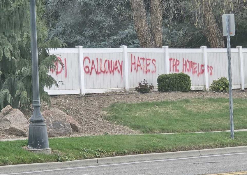 But it’s not just car attacks. Yesterday, someone posted on Nextdoor a photo of a fence on McMillan Road in Boise that had been spray-painted with the message “Codi Galloway hates the homeless.” Sen. Galloway was the lead sponsor of a bill to prohibit sleeping on sidewalks or in public parks. As I wrote last week, this law is designed not only to protect the public from the problems of vagrancy but also to help homeless individuals themselves by discouraging dangerous behavior.