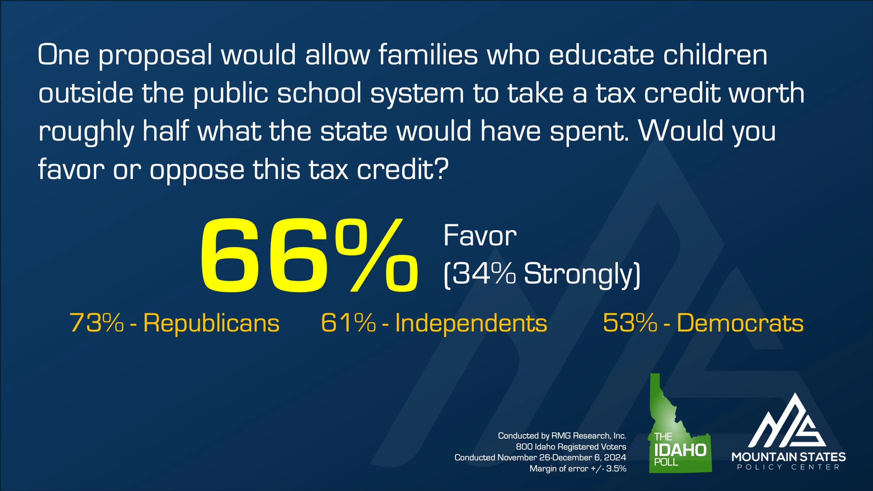 Even Democrat voters support some form of school choice. Late last year, Mountain States Policy Center asked respondents to its Idaho Poll about a potential $5,000 school choice tax credit. 73% of Republicans supported the idea, along with 53% of Democrats: