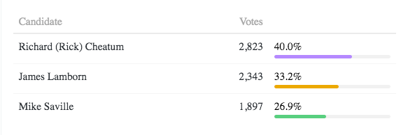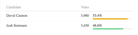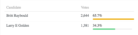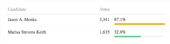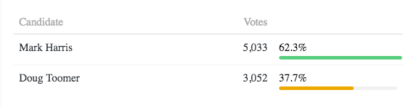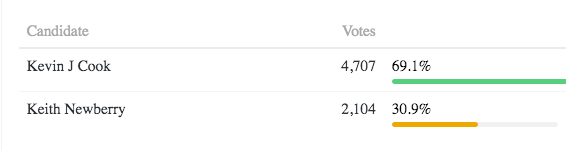 Overwhelming victory for Sen. Cook here. Even though we disagree on several issues I found him affable and knowledgeable, which makes him a hard candidate to beat.