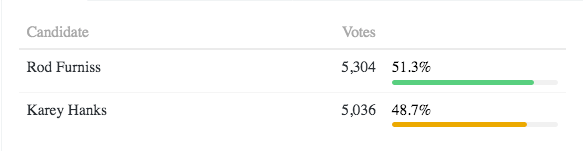 Karey Hanks gave it a good run but Rep. Furniss’ community connections turned out to be too strong. Now we wait and see if he brings up the “3 P’s” on the House floor again.