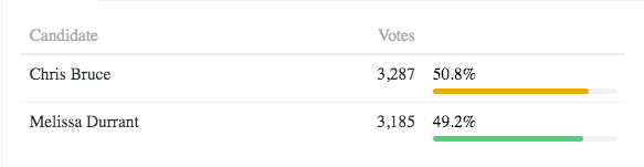 Kuna council member Chris Bruce pulled off a narrow victory over Rep. Durrant. This bodes well for school choice, as Durrant was one of the votes against the tax credit bill last year.