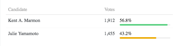 This was one of the big surprises of the night. I figured that Marmon had a chance, as Rep. Yamamoto had made a lot of poor choices over the past year, but he not only won, he won convincingly. The chair of House Ed and a strong opponent of school choice was soundly defeated —what does that bode for education issues going forward?