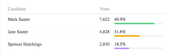 It’s interesting that Rep. Mark Sauter got 49.9% of the vote, meaning that Jane Sauter and Spencer Hutchings split a 50.1% majority. The danger of vote splitting is going to be a common theme tonight. Jane Sauter had an impressive political organization, but it wasn’t enough to topple the incumbent.