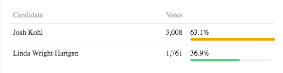 In what was perhaps the most lopsided upset of the night, Josh Kohl annihilated Sen. Hartgen in Twin Falls. I met Kohl last December, along with Clint Hostetler, at a fundraiser for Lucas Cayler, and was impressed with him, but I did not have a 63.1% victory over an incumbent senator on my bingo card.
