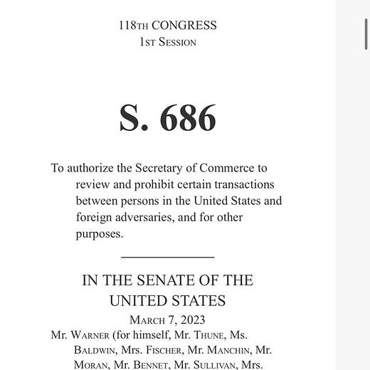 Please OPPOSE "Restricting the Emergence of Security Threats that Risk Information and Communications Technology (RESTRICT) Act" (https://www.warner.senate.gov/public/_cache/files/2/b/2b4f7206-6125-4edb-b925-7e4c64f14bdb/620D5CBA3AE75F38CE6C4D38537684C2.final-two-pager.pdf) if it comes up for a vote.