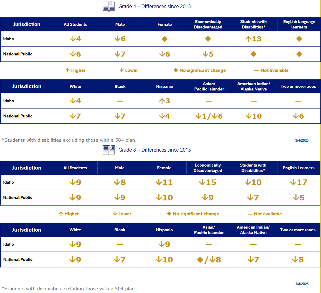 According to the National Assessment of Educational Progress (NAEP), only 41% of Idaho 4th graders are proficient in math, and just 31% of 8th graders tested as proficient. While the NAEP notes that Idaho is above the national average, that’s not saying much. Idaho taxpayers spend roughly $3 billion a year on K‑12 public schools, and results like this are unacceptable.