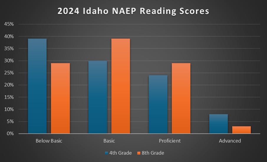 In 2024, 32% of Idaho 4th graders scored as “proficient” or “advanced.” 8th graders hit the same mark. In both cases, Idahoans were above the national average, which, as Moon pointed out, isn’t saying much.