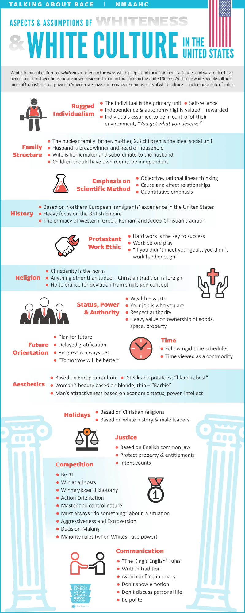If diversity is now the chief goal of society, then what is its opposite? Whiteness. The commissars of Critical Theory have declared whiteness to be a pathology in our culture. Everything we take for granted about modern civilization is vilified and marked for destruction in the new order. The Smithsonian Institution’s Museum of African-American History released an infographic a few years ago that denounced many things we would consider universal values as aspects of whiteness, including rugged individualism, the nuclear family, an interest in history, a belief in hard work, a commitment to being on time, an appreciation for beauty, and a sense of justice.