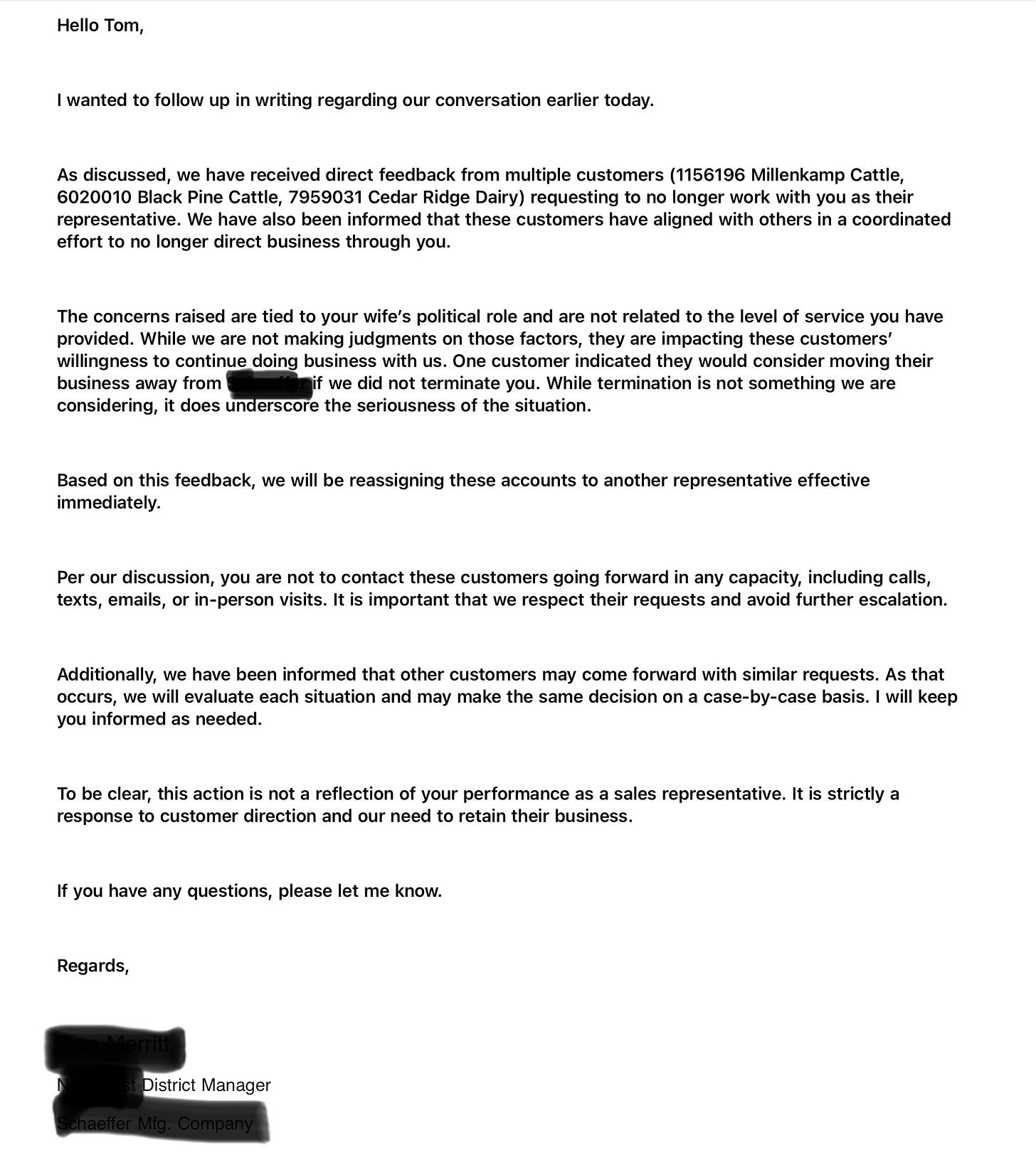 Notice that the author of the letter revealed that one customer demanded the company fire Tom Zuiderveld, and that several other companies might also cease doing business with him. Does that sound like a threat to you?
