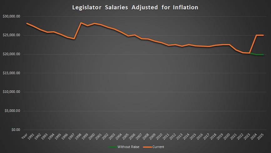 Monks went on to debate against the resolution, saying that the Legislature has fallen well behind other branches of government as well as state employees over the past fifteen years. A few weeks ago, I plotted the base legislative salary since 1991 accounting for inflation and discovered that this raise to $25,000, though stark, merely returns the Legislature to parity with its early 2000s base salary: