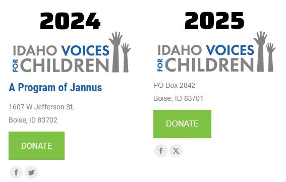 Another organization called Idaho Voices for Children, Inc. was initially founded in 1995 as the Children’s Alliance of Idaho. Its registration lapsed in 2003 after failing to file an annual report, but was reinstated in 2005, and apparently changed its name to IVC. In 2008, it changed registered agents to one located at the same Boise address as Jannus.