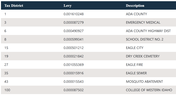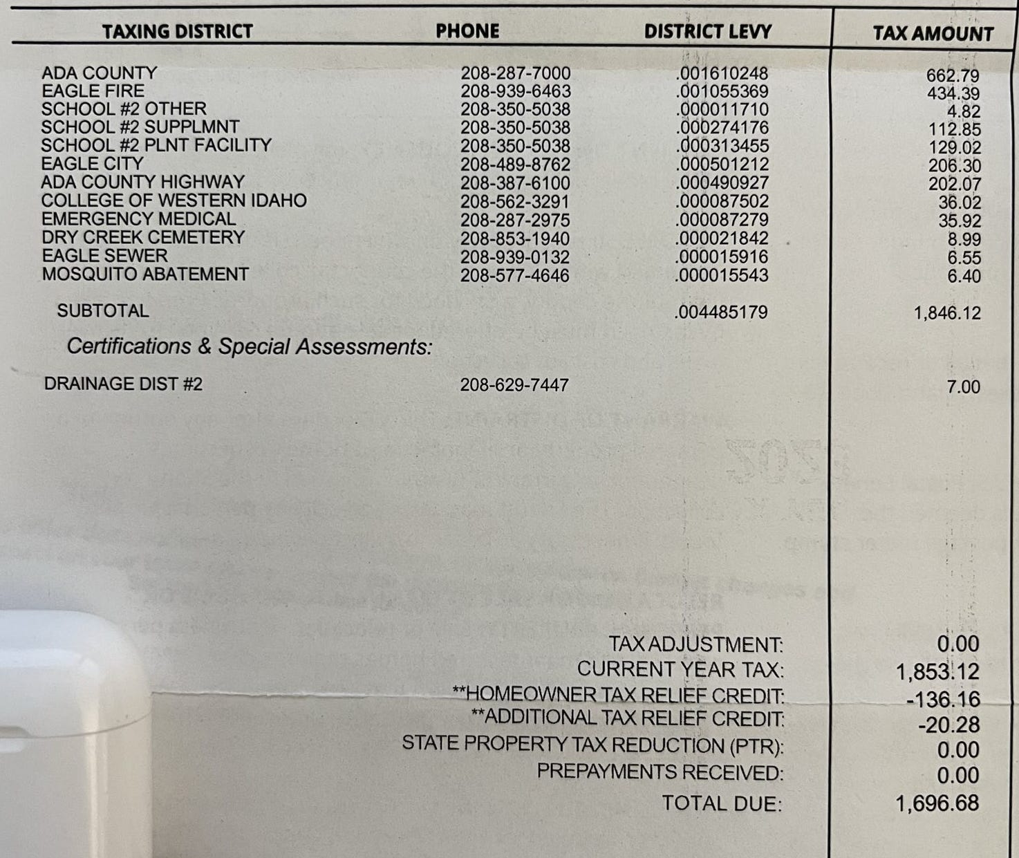 Each taxing district has its own levy rate. These districts overlap but aren't identical, so the total taxable value their levies are divided by differs. The total levy rate for my home is 0.004485179. The assessed value of my home in 2023 was $536,600. After subtracting the homeowner’s exemption of $125,000, my taxable value was $411,600. Multiplying by the levy rate and adding the amounts for each district gives me a tax bill of $1,846.12.