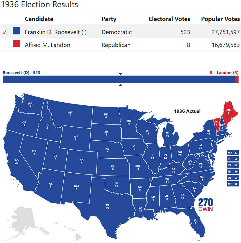 Notice the applause when FDR called for emergency powers. Had he outright declared himself a king, the American people wouldn’t have stood for it. Even before his inauguration, rumors of a coup by military and business leaders shook the nation. Yet like the Romans of Caesar’s day, Americans in the 1930s loved a leader who Did What Needed To Be Done without the kingly title. No matter how often Republicans explained that Roosevelt was far beyond precedent, or how the economy still had not recovered by the late 1930s, the American people adored him. Not only was Roosevelt reelected three more times—every election was a landslide.