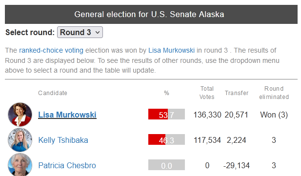 In the second round of the instant runoff, incumbent Sen. Lisa Murkowski led conservative Republican Kelly Tshibaka by only 449 votes, but benefited from being the second choice of voters who supported Democrat Patricia Chesbro, winning more than 90% of the remaining Democrat votes: