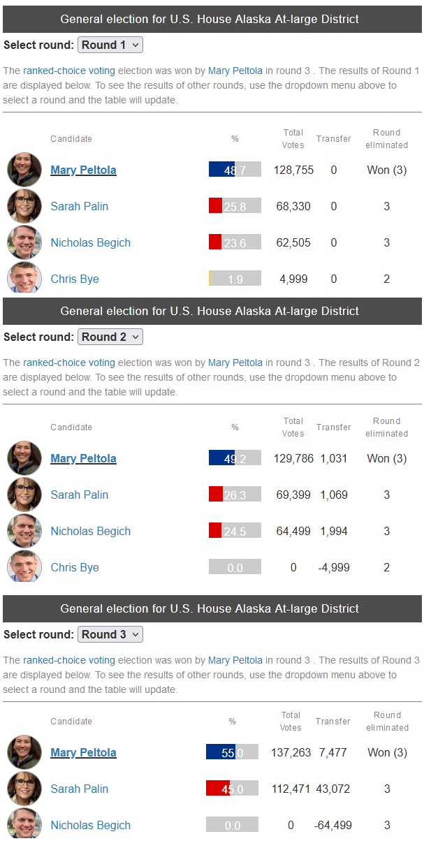 Ironically, had Begich won a few more votes in round 1, he likely would have won the whole thing, since I believe most Palin voters would have made him their second choice. Also, if you’re math savvy, you’ll notice that there were nearly 15,000 votes missing from round 1 to round 3. Those voters ended up having no say in the final count because they did not rank a third candidate.