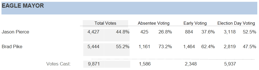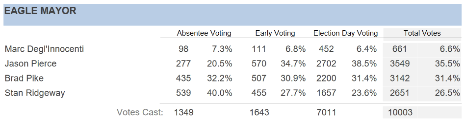 Supporters say that ranked choice voting is superior to a runoff election because it all happens at the same time, saving taxpayer money and voter time. However, it does not allow for the top two candidates to make their final pitches to voters. Running in a four way race is very different from a two way race. In the Eagle mayoral example above, both Pierce and Pike were able to alter their message once the other two candidates were eliminated. This is not possible under ranked choice voting.