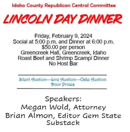 Finally, if you’re looking for something to do Friday night, I’d love to see you at the Idaho County Lincoln Day Dinner in Greencreek. Come enjoy a great dinner, bid on some auction items, and be encouraged by me and Megan Wold: