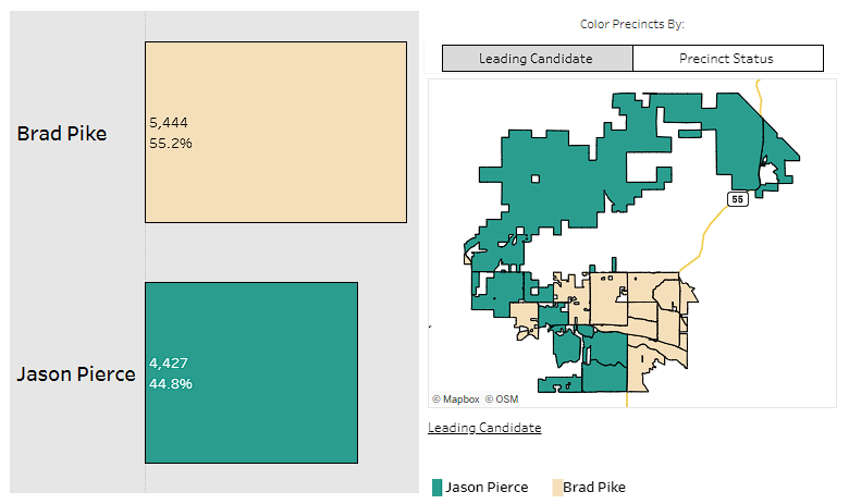 Mayor Jason Pierce fell short of his attempt to become the first two-term mayor of Eagle since the 1980s last night, losing the runoff election to Councilman Brad Pike. The incumbent gained nearly 900 votes in the second round, but it was not enough to overcome the anti-Pierce sentiment that had been promoted for the last four years.