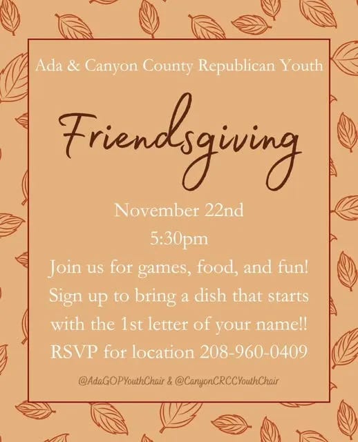 Are you a young person in the Treasure Valley? Join Ada and Canyon youth chairs Ashley Mujagic and Alexis Scott for a “friendsgiving” event on Saturday 11/22: