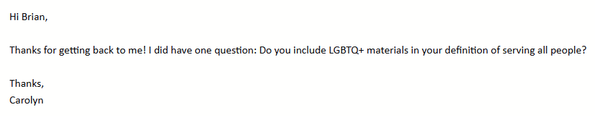 I could tell what was going on here, the angle she was going for. I replied that of course the library is for all people, and that materials are chosen by staff according to ALA guidelines, but communities should have input into that process.