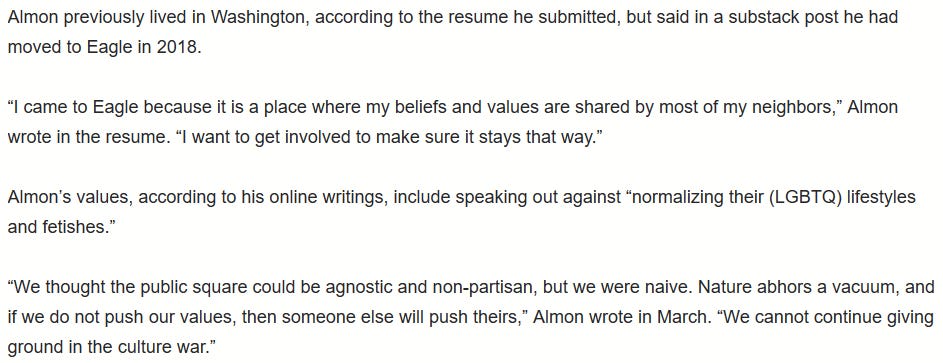 Last week, Idaho Press reporter Carolyn Komatsoulis reached out to me for comment regarding my recent appointment to the Eagle Library Board of Trustees. I sent my prepared statement, and she asked me to clarify what I meant when I said that the library was for all people: