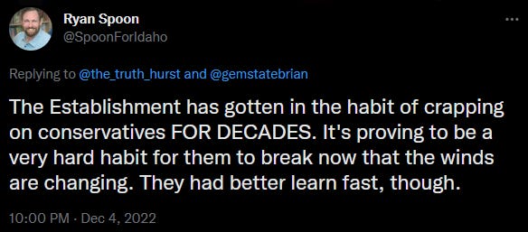 Stop trying to gatekeep the Republican Party. This goes both ways: the liberty wing must recognize that Brad Little was duly elected governor by the people, and the establishment wing must recognize that Dorothy Moon was duly elected chairwoman by the Idaho GOP.