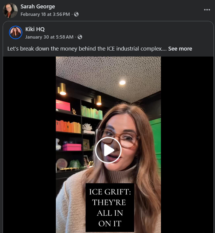 George’s last public activity prior to allegedly stealing the ambulance and crashing it into the building was a repost claiming that ICE operations are a giant grift designed to enrich powerful corporations and lobbyists. Was she already planning to attack the ICE office, or did this push her over the edge?