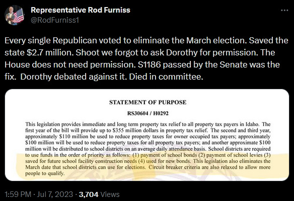 The screenshot he’s posted is from H292, the property tax relief bill. One of the components of that bill was the elimination of the March election date for school bonds and levies, since the bill compensates schools for lost property taxes. Recall that Gov. Little vetoed it for that very reason - the teacher’s unions and public school bureaucrats love low-turnout elections because they make it easier to raise taxes - but the Legislature overrode him.