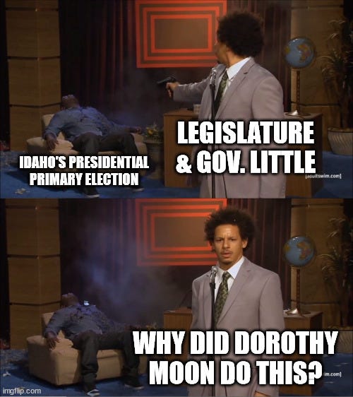 The legislation signed by Gov. Brad Little did end the presidential primary in March. But a technical loophole meant the primary didn’t get moved to May. The Senate passed a simple fix. Then, when the bill arrived in the House, Dorothy Moon, the Republican state party chair, objected in public testimony.